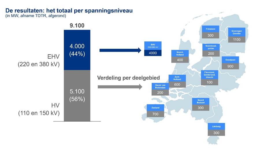 We komen op basis van de nieuwe analyses tot de conclusie dat er 9,1 gigawatt aan restruimte op het net is die door TDTR-contracten ingevuld kan worden. Het gaat om 4 gigawatt ruimte op het 380.000 en 220.000 volt hoogspanningsnet en 5,1 gigawatt op het 150.000 en 110.000 volt hoogspanningsnet. De gevonden ruimte op de 150.000 en 110.000 volt hoogspanningsnetten zijn per provincie of regio onderverdeeld.